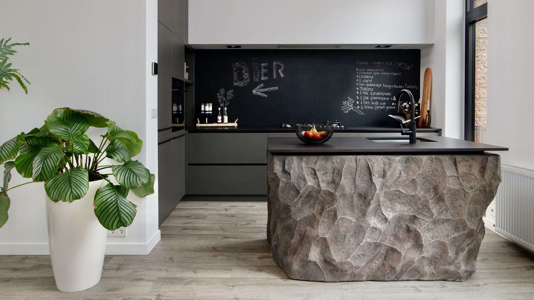 Blikvanger in deze keuken is het robuuste kookeiland met zijn stoere uitstraling. Het eiland geeft de ruimte karakter en zorgt tegelijkertijd voor verbinding tussen koken en wonen. Rondom dit middelpunt is de keuken logisch opgebouwd, met hoge kasten en een strak vormgegeven wandopstelling die rust en eenheid uitstraalt.